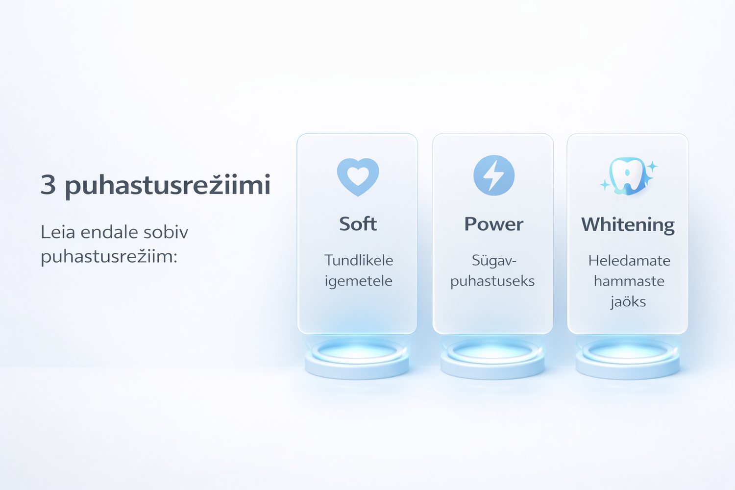 Vali Soft-režiim tundlikele igemetele, Power-režiim sügavpuhastuseks või Whitening-režiim heledamate hammaste jaoks.